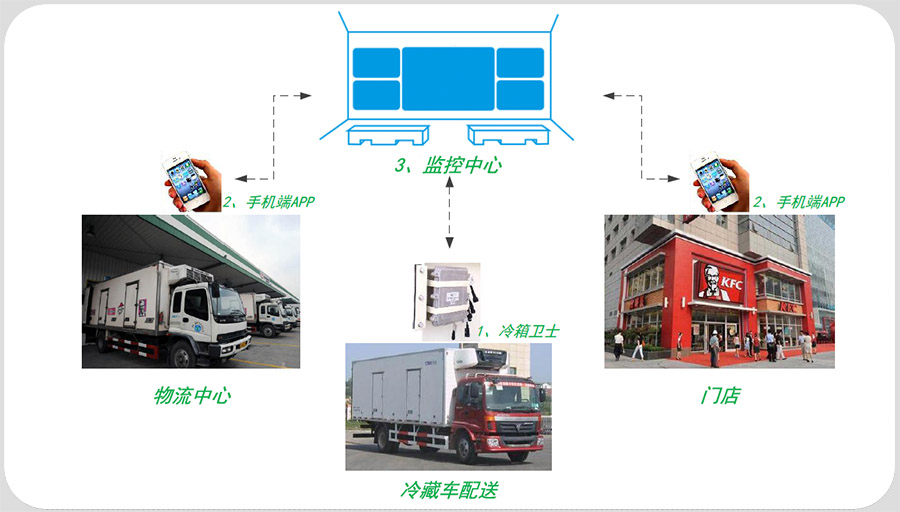 冷鏈配送監(jiān)控系統(tǒng),主要由三大部分組成:冷箱衛(wèi)士、手機(jī)端APP、監(jiān)控平臺(tái)。
