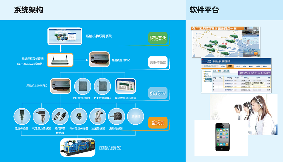 基于智能裝備物聯(lián)網(wǎng)關(guān)鍵共性技術(shù)(傳感網(wǎng)、PLC、SCADA、云計算、VOIP 呼叫中心、GIS 地理信息系統(tǒng)、移動互聯(lián)等),結(jié)合工業(yè)核心裝備,以壓縮機(jī)為范例,開發(fā)的工業(yè)裝備(壓縮機(jī))物聯(lián)網(wǎng)系統(tǒng)解決方案。